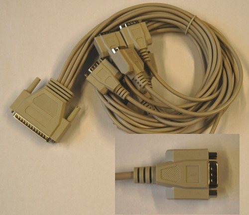 This "Octopus" cable separates the eight serial ports from the 62-signal combination connector. Each port is available on a DB9 male connector. The connector is equipped with nuts and behaves like a serial port built-in to a PC.