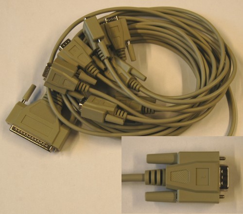 This "Octopus" cable separates the eight serial ports from the 62-signal combination connector. Each port is available on a DB9 male connector. The connector is equipped with bolts to direct fixing to a serial device.