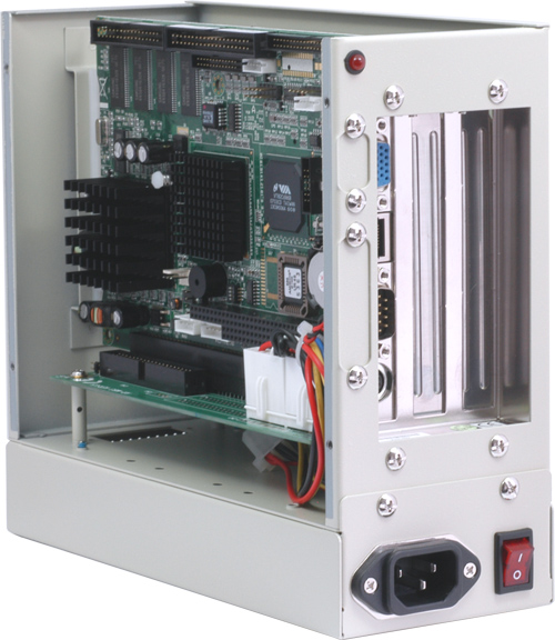 The connectivity includes 2x GbE LAN ports, 2x COM ports, and 1x CF socket. Fast serial interfaces like USB 2.0 and PCI slots facilitate the flexible expansion of system's capabilities. 90-260V AC input power supply, wide operating temperature range and ruggedized compact steel housing recommend it for deploying in harsh industrial environments. Variations possible!